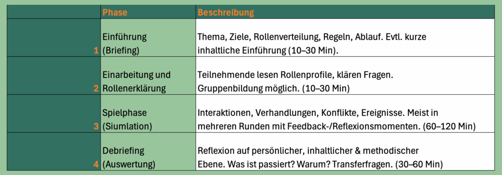 Dauer: von 90 Minuten (kompakt) bis zu mehreren Tagen (komplexe Planspiele)